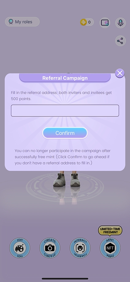 9. Click ‘MINT’ on the main page. New users can free mint a Cartoon Avatar once in a limited time. You can input the wallet address of the inviter, and both the inviter and the invitee can get 500 Lifeform points. Click ‘Confirm’ to go ahead if you don’t have a referral address to fill in.
